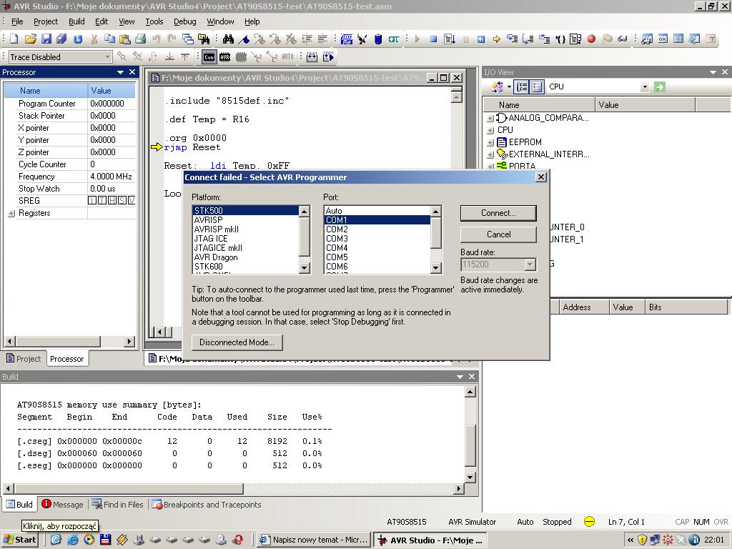 Po zainstalowani oprogramowania i włączeniu STK500 pojawił się problem z komunikacją. Zainstalowałem AVR Studio na innym kompie, bo myślałem, że mam problem z portem, ale sytuacja sie powtórzyła, sprawdzałem kabel (jest OK). Nie wiem co mam robić, może mam coś zle ustawione w AVR Studio??