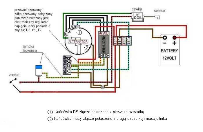 Witam czy mógłby ktoś rzucić fachowym okiem na tą okrojoną instalację i sprawdzić czy wszystko jest podłączone jak należy. Czy lampka ładowania jest potrzebna i czy jest we właściwym miejscu instalacji, można by było wyeliminować żarówkę ładowania np przez zwykły kawałek przewodu ? Cewka jest przykręcona do silnika, czy w tym przypadku konieczne jest odizolowanie jej metalowej obudowy od silnika (masy).