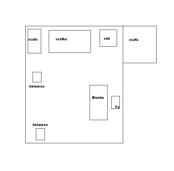 Zacznę od wielkości pokoju, jest to około 12m2. Po wygranej walce z ustawieniem subwoofera, żeby nie było przebarwienia w okolicach 60-70hz kolejna wojna, z kolumnami ! Tym razem mam trudniejsze zadanie, bo praktycznie nie mogę ich przestawić, bo stereofonia się psuje, i w innych miejscach niż siedzę słychać przebarwienia basu z suba, i muszę kombinować inaczej. Niżej rysunek z ustawieniem sprzętu w moim pokoju (nie śmiejcie się z ustawienia suba w rogu, w innych ustawieniach strasznie dudniło przy wyższym basie
