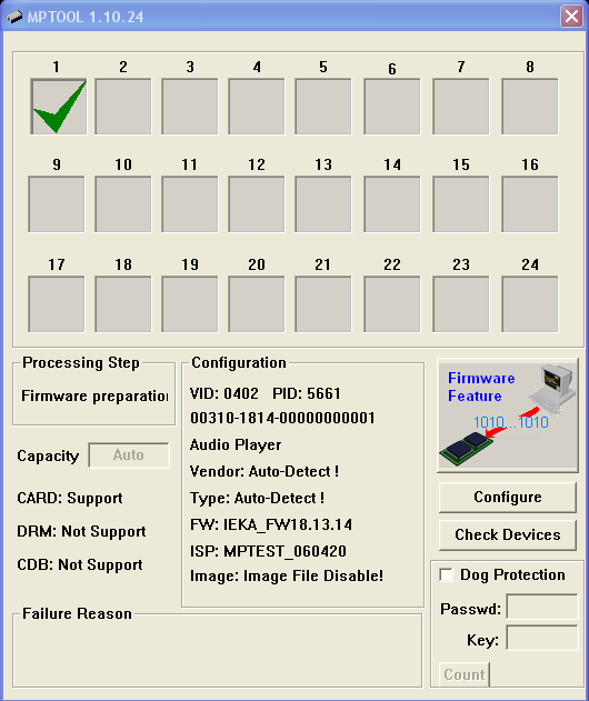 Otwierasz MD298IFO.exe, podłączasz MP3, ukazuje się program w którym są 24 okienka, w jednym po podłączeniu ukaże się żółte kółko, a po tym wciskasz Firmware Feature, robisz printscrina i pokazujesz go tutaj i myślimy dalej.