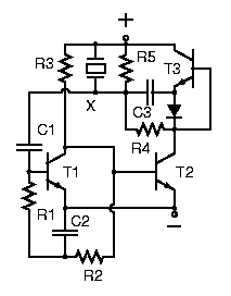 Układ w zasadzie jest multiwibratorem astabilnym, tylko z wyjściem P-P.