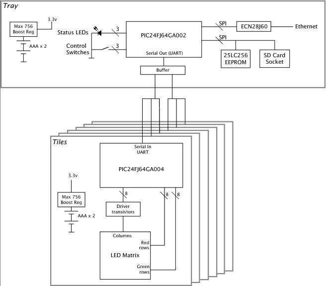 Dwa główne komponenty to: jedna podstawka i kilka segmentów które mogą być na niej rozmieszczone. Każdy segment składa się z matrycy LED 8x8, ma osobne zasilanie z dwóch baterii AAA i przetwornicy (boost) oraz zawiera jeden mikrokontroler PIC.