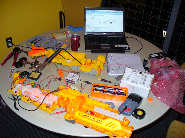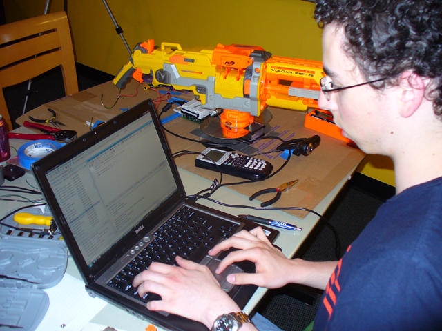 Może ktos miał okazję zobaczyć ta zmodyfikowaną zabawkę. Nerf Vulcan Rifle został początkowo przerobiony na sterowana komputerowo wieżyczkę. W tej chwili autor projektu dołożył do całego projektu rozpoznawanie obrazów. Identyfikacja realizowana jest za pomocą matlaba. Sama wieżyczka operuje w trzech trybach. Tryb autentykacji rozpoznaje czy obiekt przed kamerą jest celem czy nie, tryb strzału bez rozkazu nakazuje wieżyczce strzelać do wszystkiego co sie rusza, tryb paniki uruchamia syrenę, a karabin strzela w losowych kierunkach. Oczywiście przewidziano także precyzyjny tryb sterowania ręcznego. Poniżej kilka zdjęć i film.