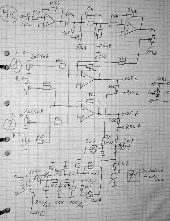 Potem jest potencometr - ekranowany, a dalej rezystory trafiające na input "-" którego impedancja niskosygnałowa dla zmiennych jest zbliżona do 0 ohm, więc również odporne na brumy. Kładłem na tym zasilacz i nie brumi. Wyjścia opampów również b.niska impedancja niskosygnałowa.