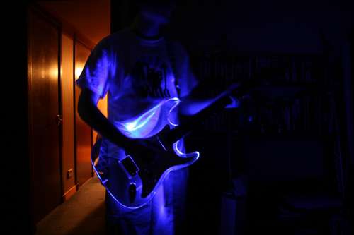 Oto przykład przerobionej gitary. Tradycyjną drewniana podstawę zastąpiono odpowiednio wyciętą podstawą z pleksi. Autor dzięki temu niewielkim później wysiłkiem dodał przełącznik i niebieskie diody LED. Dzięki temu gitara nabrała niesamowitego wyglądu. O wiele ciekawiej co prawda by było, gdyby autor dodał możliwość regulacji świecenia w zależności od dźwięków wydobywanych z gitary, ale i tak projekt dosyć ciekawy, prosty, ale nei jestem pewien czy przy tej grubości pleksi tani...