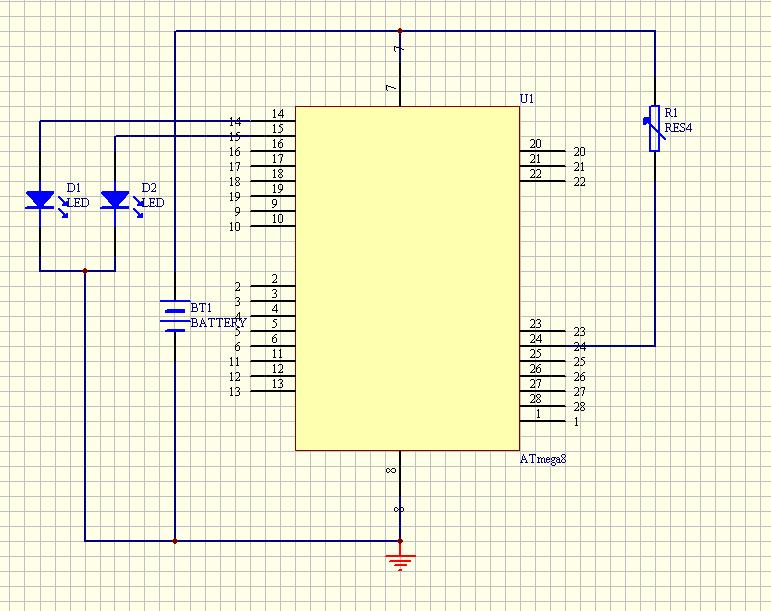 2.Jeżeli na porcie PC1 (Adc1) pojawi się napięcie od 1.6 do 4.5V to zaświeci się dioda 2 (PB1 stan wysoki)