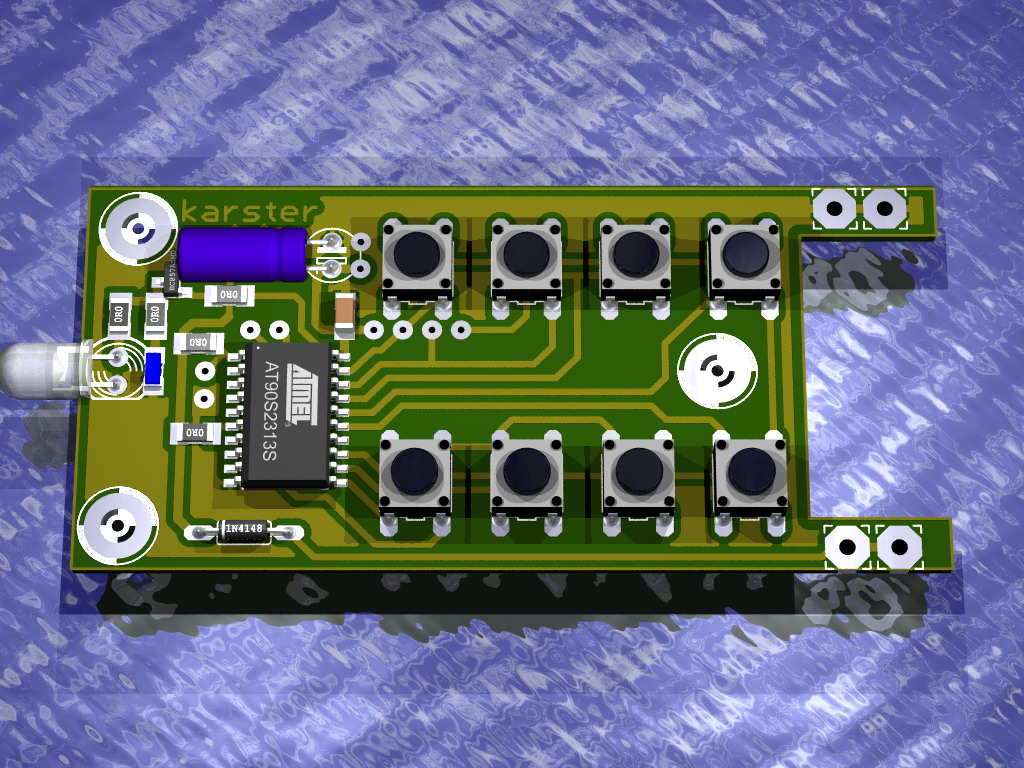 Attiny2313 działa na wewnętrznym rezonatorze 8MHz. Generowanie nośnej 36kHz na timer0, odliczanie czasu potrzebnego do kodu rc5 na timer1.