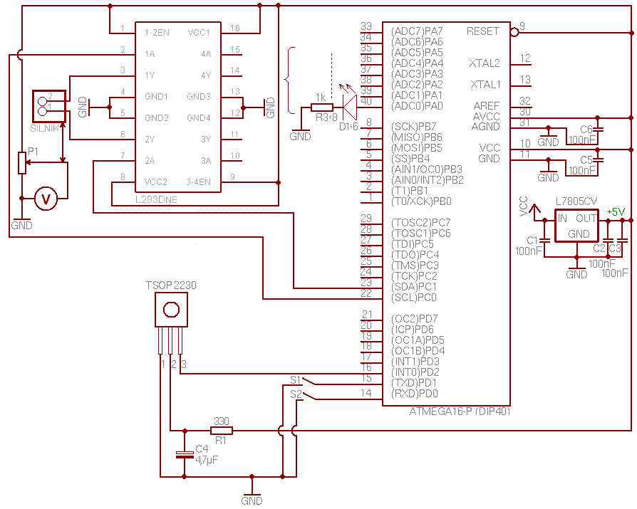 Poniżej załączyłem schemat układu. Trudno mi sprecyzować problem, ponieważ jeszcze wczoraj wszystko działało. Dzisiaj chciałem zaprezentować projekt swojemu prowadzącemu i była kompletna klapa. Otóż, po włączeniu zasilania powinny świecić się diody na porcie A. Żadna się nie świeciła. Po odłączeniu zasilania od sterownika L293DNE, zapaliły się wszystkie diody. Niestety i tak procesor nie reagował na sygnał z pilota RC5, który miał być wyświetlany za pomocą diód. Podawałem zasilanie 7,5V na stabilizator. Później zmniejszyłem napięcie do 6V. Wtedy diody zaczęły szybko mrugać. Procesor nadal nie reagował na żaden sygnał. Przed chwilą przysiadłem do układu jeszcze raz i odłączyłem napięcie zasilania od odbiornika podczerwieni. Wówczas diody zgasły, jakby nie było wogóle zasilania na procesorze. Gdy odłączam kondensator między "+", a masą przy odbiorniku również gasną diody na porcie i nic nie mogę zrobić. Miałem wcześniej ten problem, ale nie wiem dlaczego, po krótkotrwałym zwarciu masy i "+" zasilania procesor, jakby się odblokowywał i już dalej mogłem robić co mi się podobało i wszystko działało. Na następny dzień (nie ruszając układu) znowu miałem ten problem. Zauważyłem również, że grzeje mi się stabilizator, chociaż nigdzie na pewno nie ma zwarcia, ponieważ wszystko dokładnie sprawdziłem. Nie mogę pojąć tego co się dzieje, ponieważ wszystko działało bez zarzutu, a nagle nic nie działa, mimo, że nie ruszałem wogóle układu. Jeżeli ktokolwiek, miał taki problem, albo po prostu wie co może być przyczyną to proszę o podpowiedź, co robić. Jestem już zdesperowany, ponieważ totalnie nie rozumiem dlaczego tak się dzieje. Z góry dziękuję za pomoc.