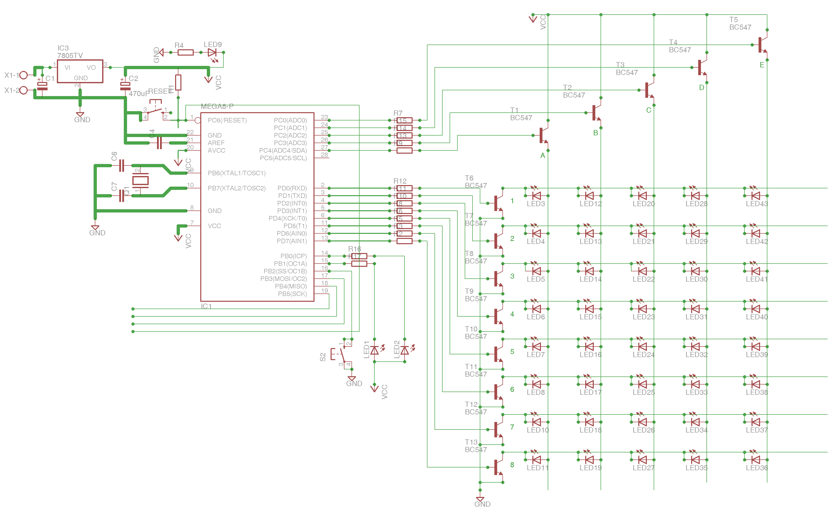 A sprawa schematu jeszcze to rezystory na zasilaniu - zastanawiałem się nad daniem nie na 5 lub 8 kanałów w tranzystory ale dla każdej diody LED osobno. Wyeliminuje w taki sposób różne odcienie świecenia diod na poszczególnych kanałach