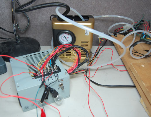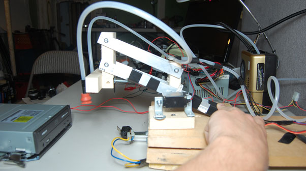 Choć projekt nie jest jeszcze skończony, to warto mu się przyjrzeć. Jego zasada działania jest prosta - ramię robota podnosi płytkę, a następnie obraca się i opuszcza ją na tackę napędu(który jest zamykany za pomocą przekaźnika, imitującego przełącznik wsuwania/wysuwania tacki). Gdy jest potrzeba kolejna płytka, komputer otwiera napęd, a robot wyciąga z niego nośnik i odkłada go na osobny stos, i dalej postępuje jak na początku tego opisu. Przerobiona pompa do opon zapewnia próżnię potrzebna do podniesienia CD, a światło stopu pracuje jako rezystor "oszukujący" zasilacz PC, by dostarczał energie do układu. Pracą serw steruje arduino z ze specjalnym interfejsem (motor shield).