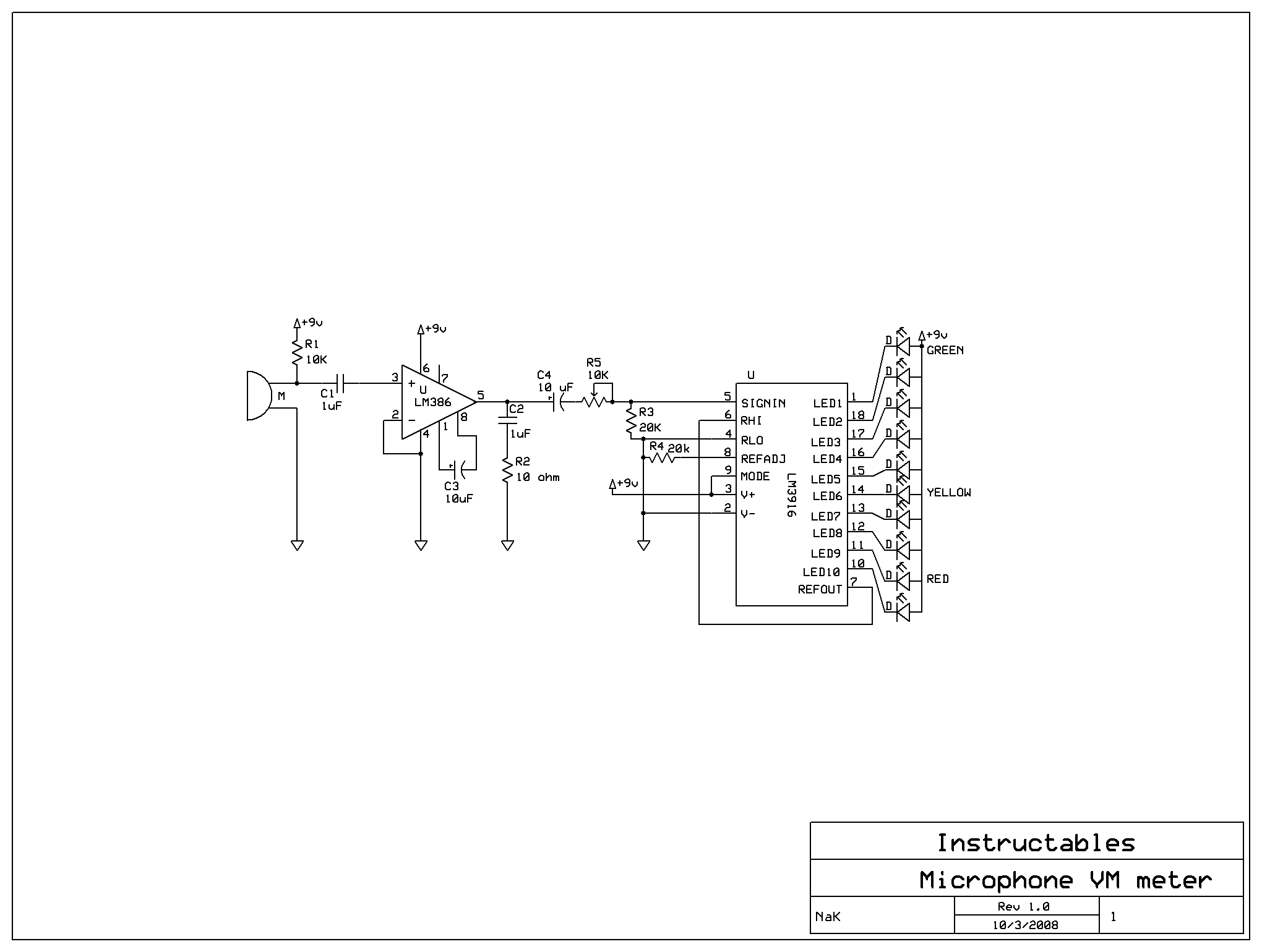 Układ składający się z 10 diod LED, układu scalonego LM3916 IC i LM386 IC, dwóch gniazd na baterie zegarkowe,mikrofonu, a także przycisku pozwala na stworzenie prawdziwego wskaźnika wysterowania. Urządzenie zostało zaprojektowany by można było je schować np. do kieszeni.