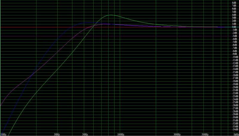 - różowa; obudowa 70l, strojona na 20Hz - torchę lepiej, niski bas nadal cichy, jednak sub już nie dudni