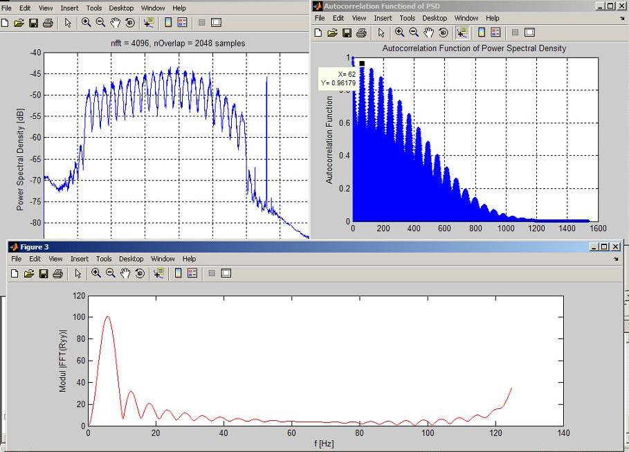 Piszę w Matlabie skrypt wyznaczający odstęp częstotliwościowy Δf pewnego sygnału OFDM. Wyznaczyłem widmową gęstość mocy (PSD), następnie funkcję autokorelacji widmowej gęstości mocy Ryy. Maksimum Ryy odpowiada Δf. Kolejne maksima pojawiają się z okresem odpowiadającym Δf, czyli na przykład:
