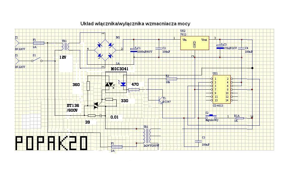 Cały układ jest zbudowany na dwóch układach jeden to stabilizator 12V (7812) a drugi to CD 4013 który steruje przekaźnikiem. Gdy na wejściu układy CD 4013 pojawi się impuls i powoduje załączenie przekaźnika, a gdy dostanie ponownie impuls to wył(Ą)cza przekaźnik który zał(Ą)cza lub wył(Ą)cza wzmacniacz.