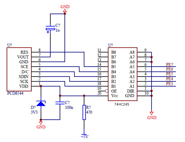 Zaczynam się uczyć obsługi wyświetlacza z Nokii3310 ze sterownikiem pcd8544. Posiadam zbudowany układ oparty na Atmedze128 (moduł ZL7AVR zintegrowanym kwarcem 16MHz) zasilanej z 5V, z podłączonym jest do niej wyświetlaczem poprzez bufor 74hc245. Całość programuję w języku C, za pomocą różnych aplikacji (winavr, avrstudio, codevision avr..)
