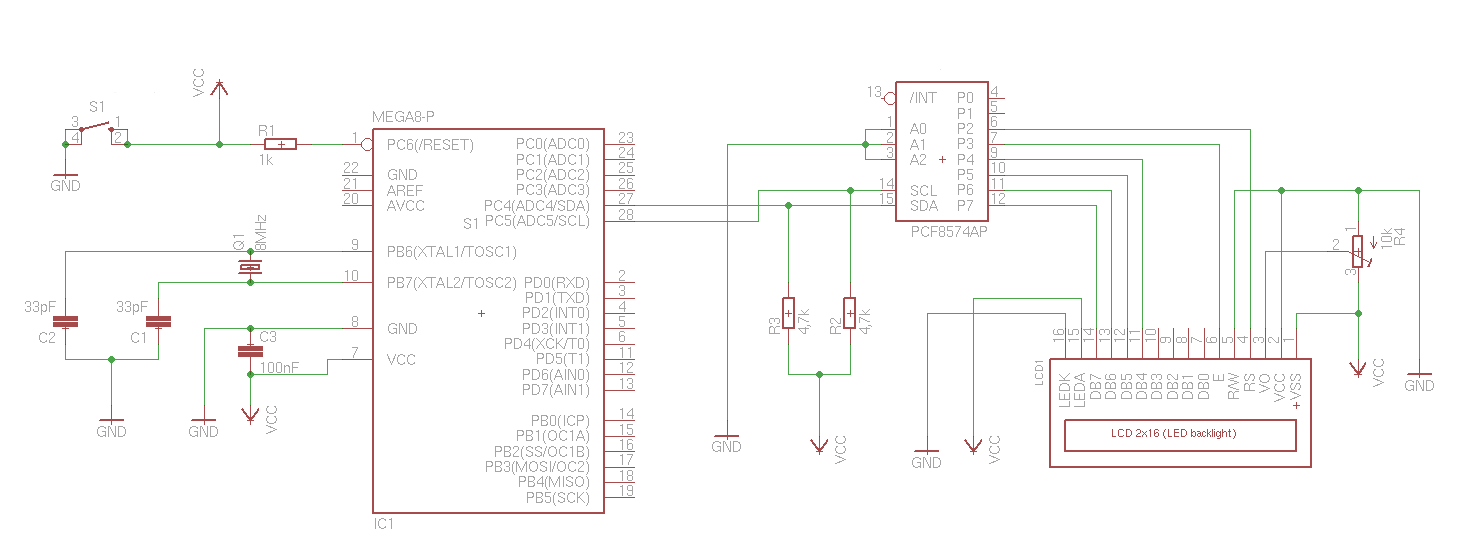 Do mikrokontrolera podpięty jest kwarc 8MHz oraz w pobliżu do linii VCC i GND kondensator 100nF, na linii SCL i SDA sa rezystory 4,7k, układ w całości jest zasilany zasilaczem 5V 450mA.