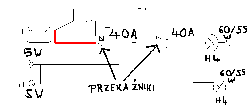 Byłem ostatnio zmuszony do zrobienia świateł w moim malczanie od początku zrobiłem to tak jak przedstawia poniższy schemat (się na tym nie znam ale powinniście zrozymieć) i w miejscu zaznaczonym na czerwono powinienem chyba wstawić jakiś bezpiecznik i ile powinien on mieć amperów?