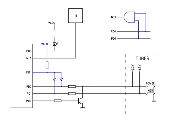 Czy schemat który przedstawiłem (część niebieska) będzie spełniać swoje zadanie? Czy wersja z diodami będzie wystarczająca, czy potrzebna będzie bramka? Czy cały układ nie będzie wprowadzał zakłóceń do tunera?