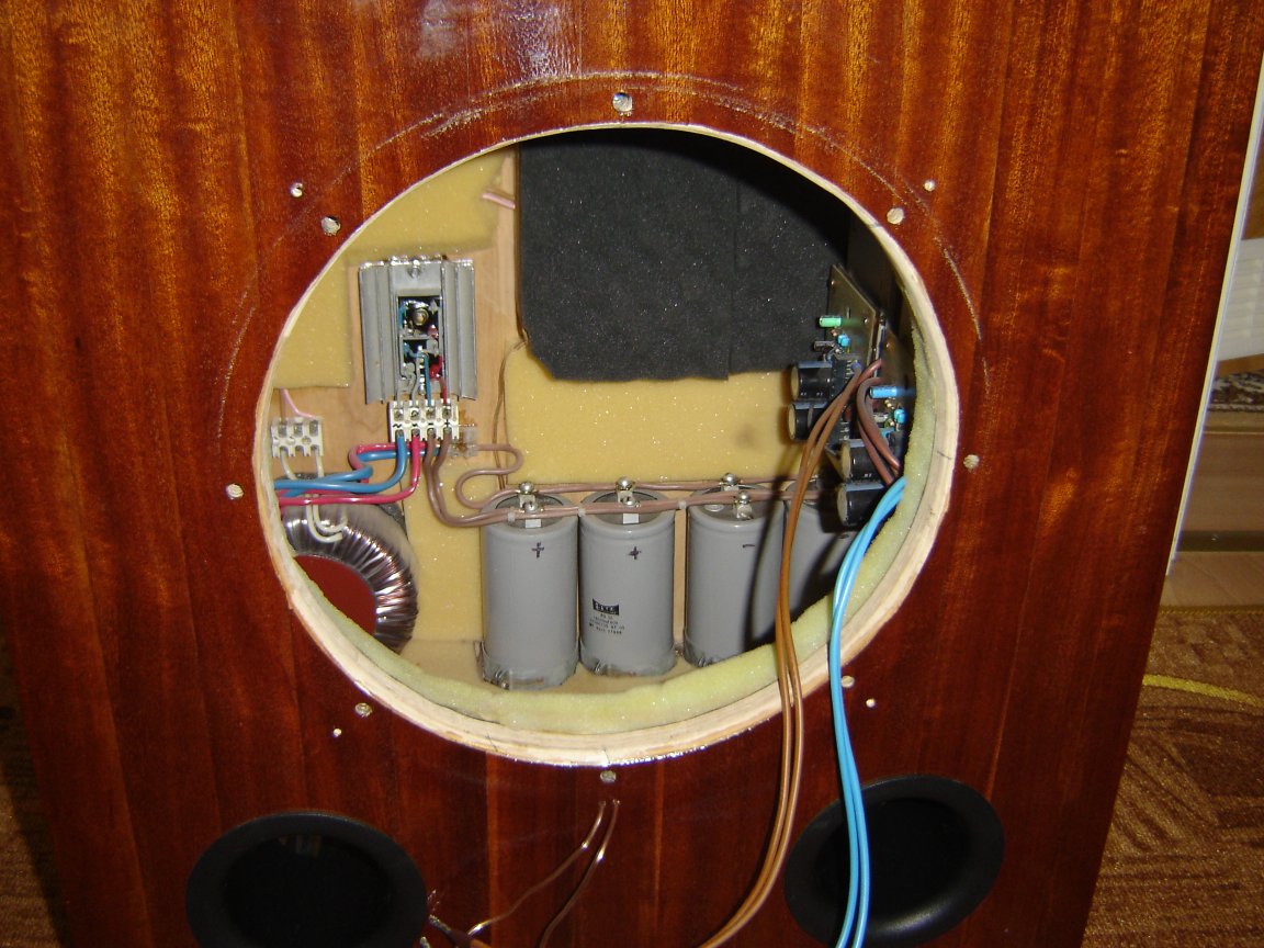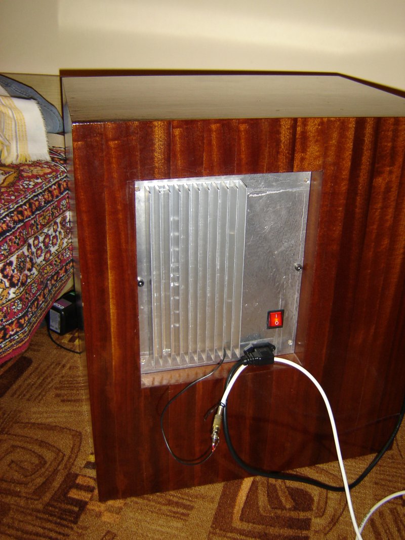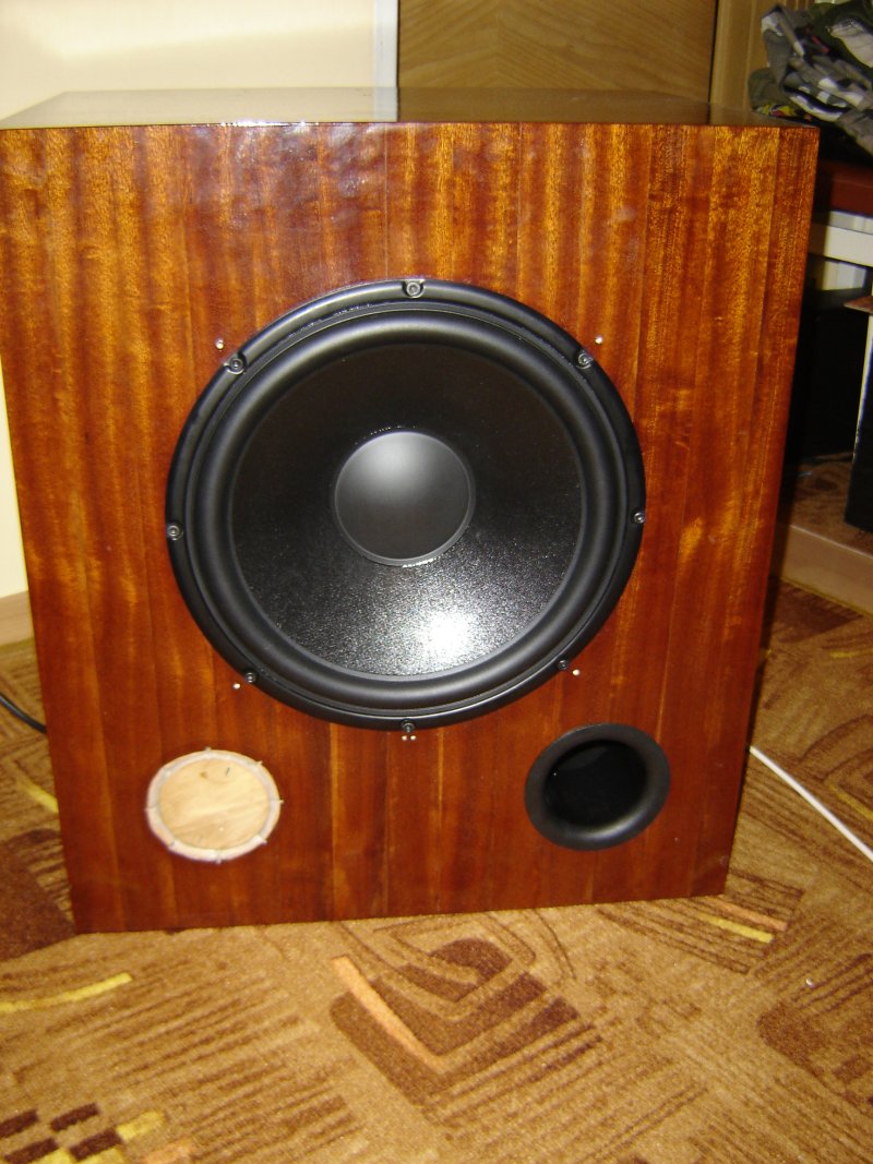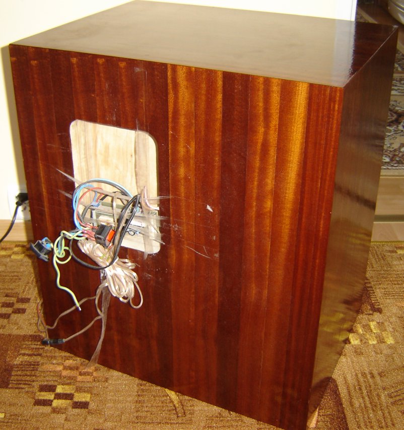 Mile widziana pomoc w dobraniu głośnika do skrzyni jako że jest oklejona fornirem, polakierowana nie chcę jej niszczyć ani ciąć. Jak widać na fotach wewnątrz jest umieszczone trafo, mostki, kondensatory, po prawej stronie nawet wiszą dwie końcówki mocy na TDA 7294 które pracują w mostku. Obudowa posiada następujące wymiary W 57,2cm - S 50cm - G 36,8cm ścianki mają grubość 1,8 cm całość wykonana z sklejki, wytłumiona gąbką; przybliżona objętość obudowy po odjęciu wszystkiego co tam siedzi to około 80L. w obudowie są dwie rurki BR stożkowe, średnica wlotu 75mm wylot 70mm oryginalnie o długości 155mm przedłużone do prób o 100mm.