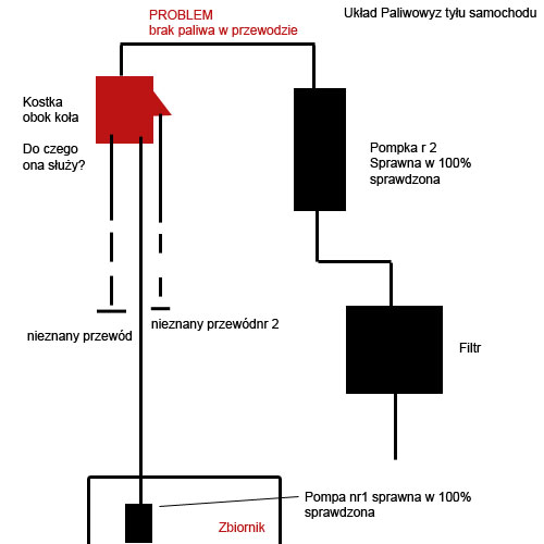 Piszę ponieważ nie mam już pojęcia co jest przyczyną tego iż moje VW Polo Fox '92 nie dostaje paliwa do wtrysku. Praktycznie zaparkowałem auto w garażu i następnego dnia już nie odpalił, miałem ok 5 l rezerwy, pomyślałem że może za mało paliwa,dolałem kolejne 15 i nadal to samo. Zacząłem sprawdzać co jest przyczyną, ewidentnie przez wąż zasilania nie jest podawane paliwo, sprawiłem najpierw pompe paliwa w zbiorniku, jest sprawna, leci aż miło, następnie drugą przy kole, również to samo z tym że tutaj już nie leciało tak jak miało. Przyczyna tkwi w plastikowej kostce która znajduje się tuż obok drugiej zewnęrznej pompki. Nie wiem czemu ono służy ale podłączone są do niej w sumie 4 przewody paliwowe, jeden jest bezpośrednio ze zbiornika i pompy w zbiorniku , kolejny idzie do drugiej pomki, natomiast 2 pozostałe nie są wyjaśnione. Problem polega na tym, iż pompa ze zbiornika tłoczy paliwo do tej kostki natomiast z tej nic nie idzie dalej na drugą pompkę i ostatecznie do zasilania wtrysku. Nie wiem zupełnie dlaczego, może w tym urządzeniu coś się zablokowało, chociaż przedmuchałem je i nie było raczej problemów, a paliwo nie idzie.