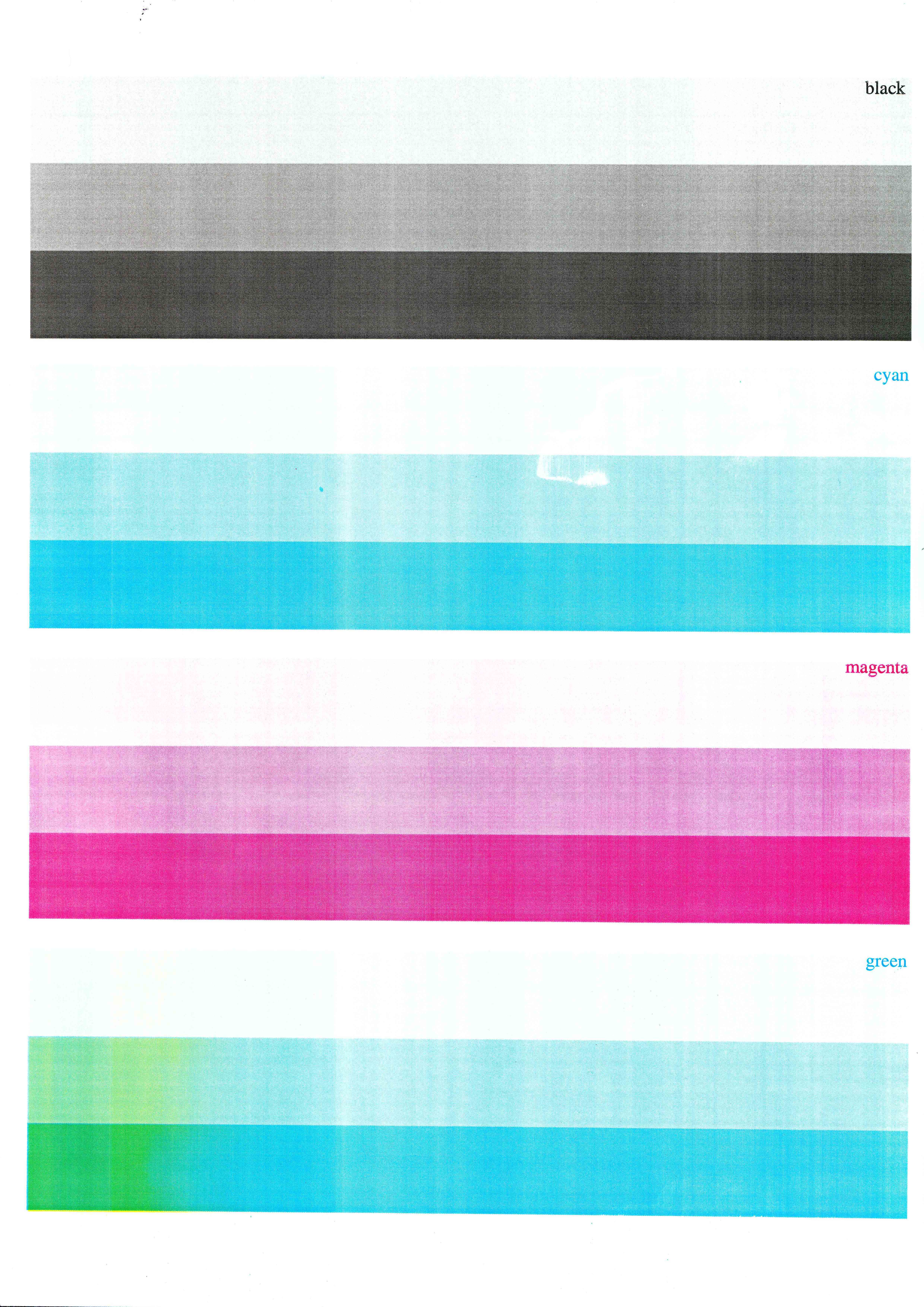 Zacznę jednak od początku. Najpierw wystąpił problem z zasilaczem. Drukarka została odesłana do serwisu, wróciła naprawiona. Serwis dołączył wydrukowane testowe strony, wszystko w porządku. Po dotarciu do biura wymagała jednak kalibracji - prawdopodobnie ze względu na transport. Przez kilka dni nie było problemów, po wymianie zółtego tonera drukarka zdecydowała się nie współpracowac. Oto zeskanowany obraz testowy