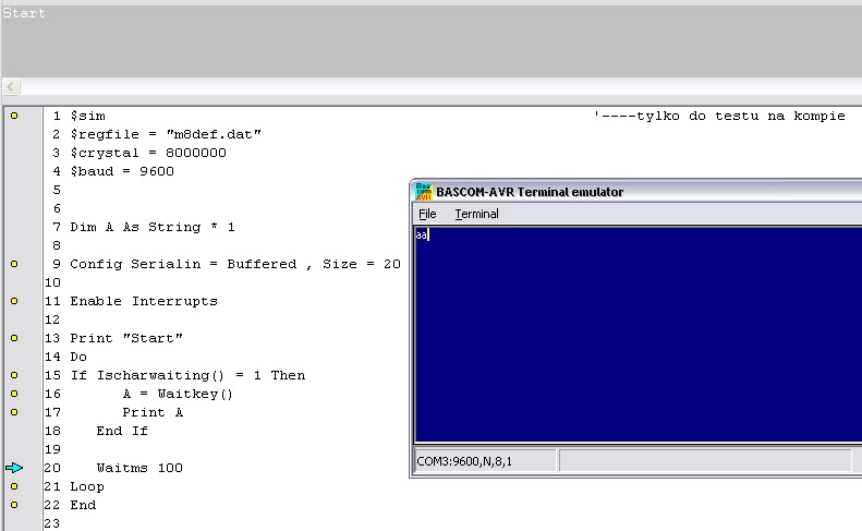 Kompiluje i odpalam w symulatorze. Odpalam też Terminal symulator piszę 'a' i nic się nie dzieje.