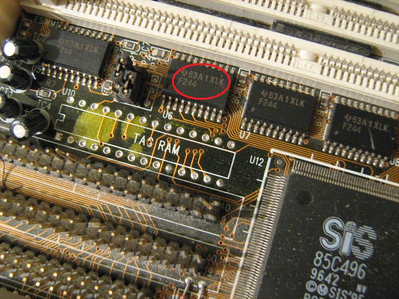 Jako bufor chciałbym wykorzystać scalak ze starej płyty głównej. Nie jestem na 100% pewny, czy jest to to samo co 74hc244, ale na 90% tak - końcówka f244 i zawsze w starych płytach głównych jest stosowany szereg tych buforów, tylko nie w wersji smd. Pewnie to ten sam bufor, tylko, że innej firmy, aczkolwiek upewnić się nie zaszkodzi. Foto: