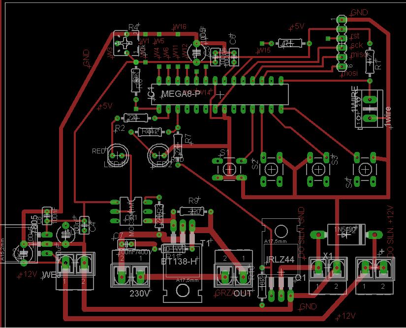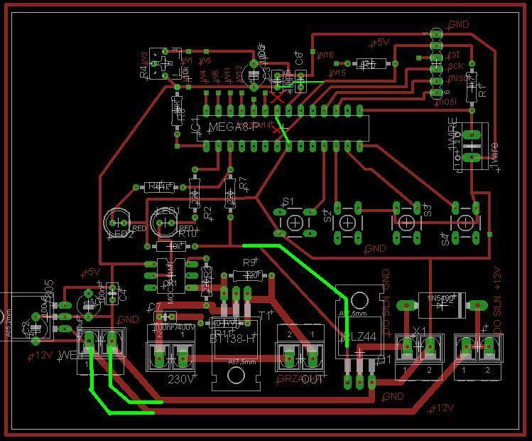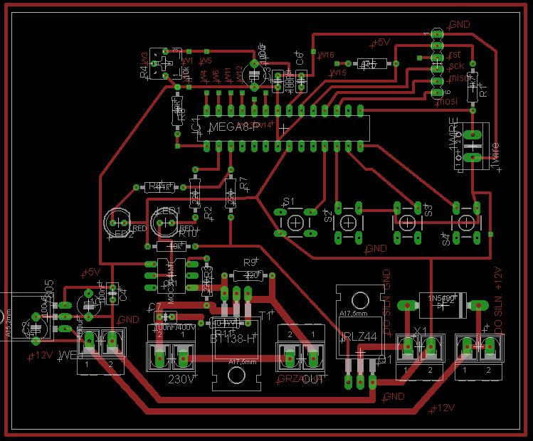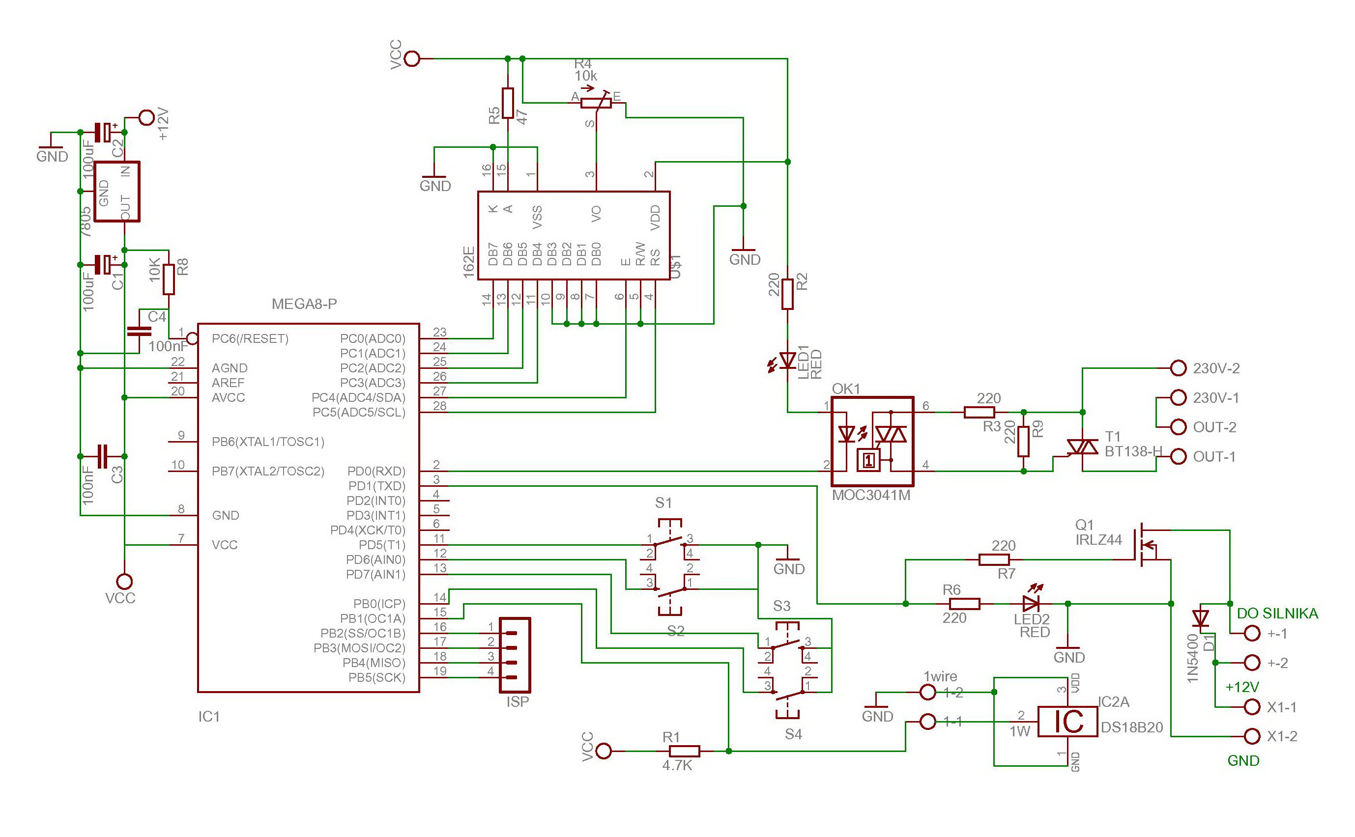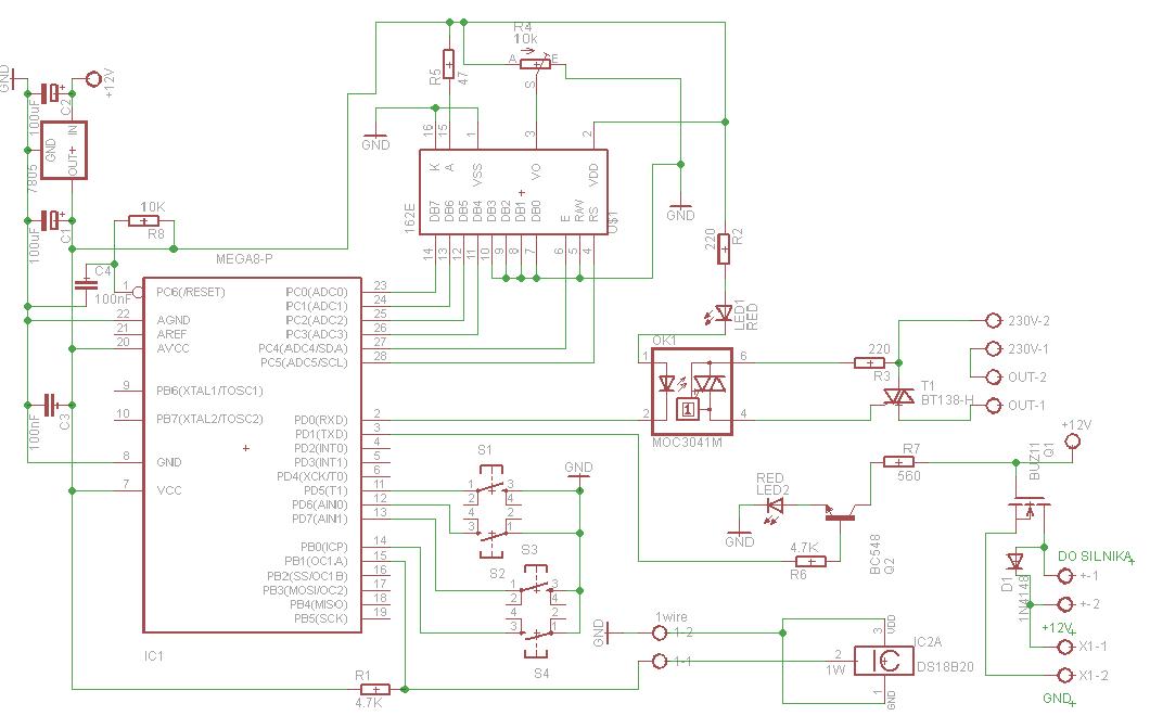 Proszę o sprawdzenie schematu. Jest to programowalny regulator temperatury, który steruje grzałką 2kW poprzez triak BT138 oraz silnikiem 12VDC (np. takim od wycieraczek samochodowych) napędzającym mieszadło. Pomiar temperatury przez DS18B20. Do tego wyświetlacz LCD 4x16 lub 4x20.