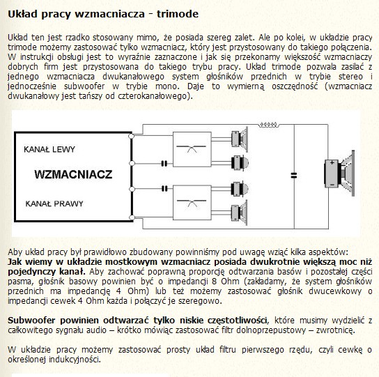 Doczytałem na forum że jest możliwe podłączenie do wzmacniacza 2 kanałowego jednej pary głośników i skrzyni Połączenie takie nazywa sieTrimode