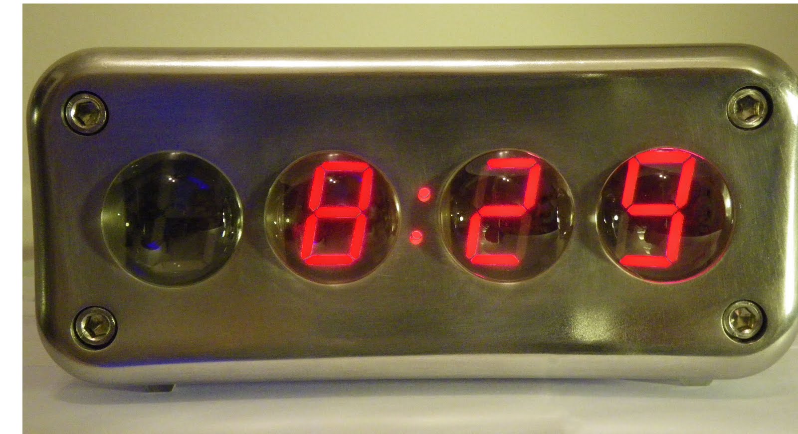 Opisywany zegar różni się od innych czasomierzy bardzo pomysłowym wyświetlaczem. Składa się on z 7 segmentowych modułów LED zamontowanych na posuwie liniowym, przesuwającym je do przodu i do tyłu za kilkoma soczewkami. Taki układ pozwala programowo rozmywać obraz cyfr poprzez umieszczanie ich poza ogniskiem układu optycznego, co widać na załączonym filmie. Mózgiem zegara jest moduł Dorkboard (oparty o mikrokontroler ATmega128), który w losowych momentach przesuwa wyświetlacze. Obudowa powstała z frezowanego i polerowanego aluminium, a przyciski u góry obudowy to kulki z dużego łożyska. Na stronie projektu można znaleźć dokładną dokumentację.