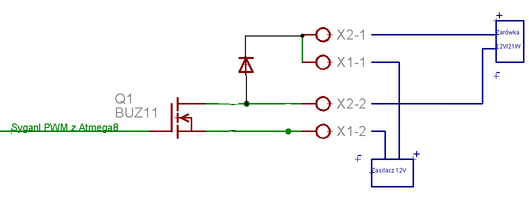 1. Procesor potrafi się czasem zresetować, przeskoczyć do jakiejś etykiety, itp (występuje to tylko, gdy zmieniam wypełnienie PWM, tak "nagle, samo z siebie" nie występuje). Ale tylko gdy podłączone jest obciążenie pod MOSFET... Zauważyłem, że dołączenie 100nF równolegle do żarówki trochę pomaga.