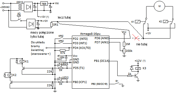 Mam zbudowany układ na podstawie atmega8 obsługujący bramę przesuwną. Atmega uruchamia jeden z dwóch przekaźników powodując uruchomienie silnika prądu stałego w jednym kierunku obrotów bądź drugim. Układ działa tak jak należy na "sucho" czyli na biurku poskładany, nie podłączony do silnika. Ale gdy już układ jest na swoim miejscu to chwile po uruchomieniu silnika (czasem jest to mniej niż pół sekundy) atmega chyba się resetuje, bo wraca do poprzedniego stanu. Jeden z przewodów zasilających silnik jest poprowadzony pod płytką drukowaną, w miejscu gdzie jest uC. Przez przewód płynie ok 2 - 3A. Dodam, że - nie ma różnicy czy pod nóżke reset podłącze +5V przez rezystor 49kOm czy zostawie w powietrzu, przy nóżce mam podłączony do masy kondensatorek 100n, układ jest stabilizowany przez 7805, przed którym jest +12V i elektrolit 470uF. Przekaźniki są zasilane z punktu przed 7805 (+12V + elektrolit).