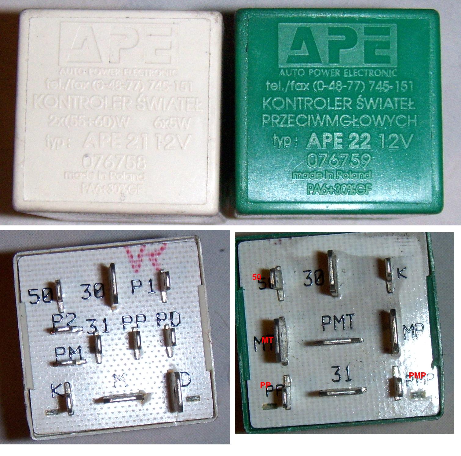 Szukam schematu podlaczenia przekaznikow APE 22 (kontroler swiatel przeciwmglowych-bialy) oraz APE 21 (kontroler swiatel - zielony).