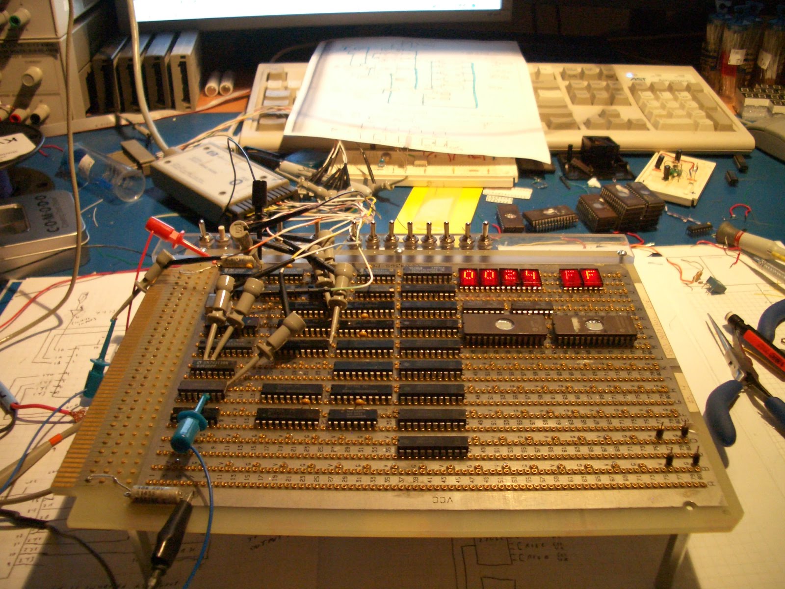 Poniższy projekt to komputer zbudowany tylko i wyłącznie na bramkach logicznych TTL. Powstawał przez dwa miesiące i w tej chwili jest gotowy do przedstawienia. W tej chwili cala jednostka to 8-bitowy komputer potrafiący ładować i przechowywać adresowane instrukcje i rejestry z rozkazami w pamięci. Wszystkie schematy i opis budowy i działania poszczególnych bloków komputera.