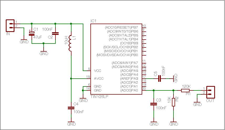 Prób dokonuję na procku ATtiny26. Poniżej schemat.
