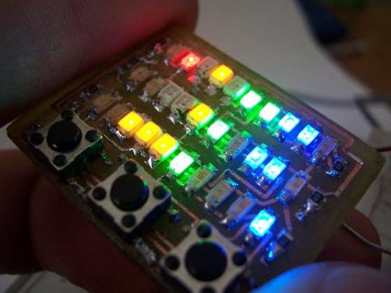 Rgbphil wykonał projekt zegarka Microdot zbudowanego na kolorowych diodach montowanych powierzchniowo. Projekt jest stosunkowo tani w budowie, wystarczy tylko kilka przycisków, rezystorów, kondensatorów, diod świecących, kwarc. Całość zbudowana jest w oparciu o mikrokontroler PIC16F88. Schematy i kody źródłowe dostępne są na stronie źródłowej. Poniżej zamieszczam kilka zdjęć i film prezentujące działanie urządzenia.