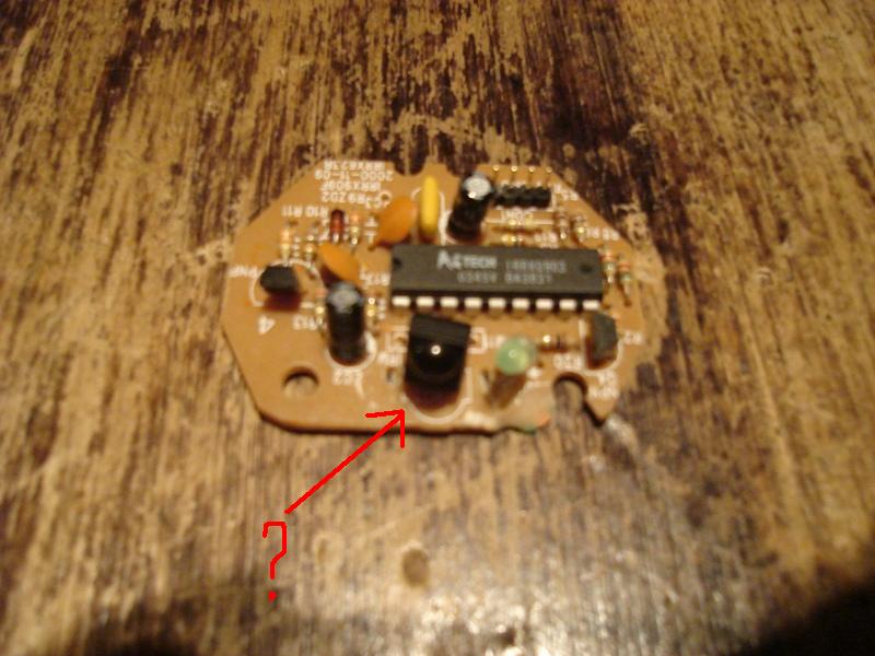 - Mam również 'część' myszki, którą podłącza się do komputera. I znów pytanie czy to co zaznaczone to fotorezystor bądź fototranzystor? Jeśli tak to jak go też podłączyć. Ma on 3 nóżki.