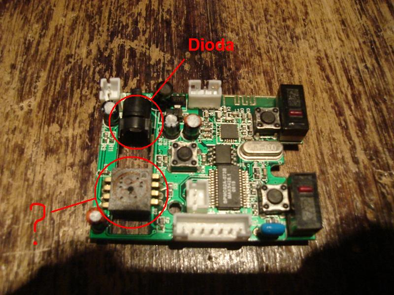 Mam myszkę laserową i chciałbym z niej pozyskać tenże element. Nie znam się na tym dokładnie, i nie wiem jak to może wyglądać. Tutaj przedstawiam zdjęcie, na którym znajdują się wnętrzności myszki. I moje pytanie się tu pojawia: Czy to co jest zaznaczone na czerwono ze znakiem zapytania to fotorezystor bądź fototranzystor? Jeżeli tak to jak go podłączyć to do głośnika dwoma kabelkami?