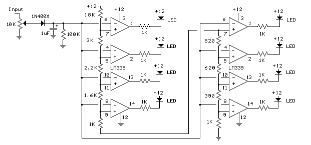 Ten układ używa dwóch poczwórnych wzmacniaczy operacyjnych, aby utworzyć 8 diod LED mierników poziomu dźwięku. Wzmacniacz operacyjny zastosowany w tym obwodzie to LM324. To powszechny układ scalony i jest łatwo dostępny. Rezystory 1K są potrzebne, aby diody LED zapalały się przy różnych poziomach dźwięku. Można zmieniać te rezystory, mimo że wszystkie powyżej 5K mogą spowodować, że niektóre diody LED nigdy się nie włączą. Układ ten można łatwo rozbudowywać dołączając wzmacniacze operacyjne, nie ma ograniczeń w stosowaniu LM324.