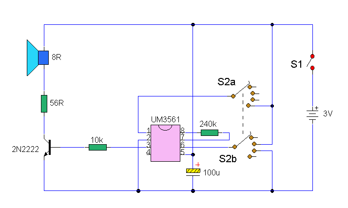 Ten układ używa UM3561 do generowania 4 różnych efektów dźwiękowych