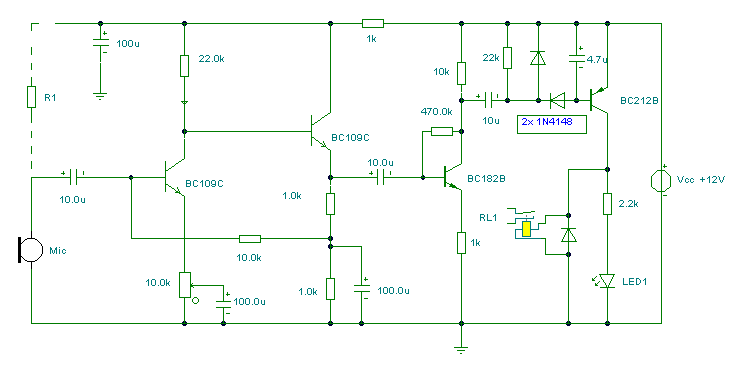 Ten czuły przełącznik obsługiwany dźwiękiem może być stosowany z dynamicznym mikrofonem jak wyżej lub z mikrofonem elektretowym (ECM). Przy zastosowaniu mikrofonu elektretowego konieczne jest dołączenie R1 (linia przerywana). Wartość właściwa powinna zawierać się między 2.2k i 10k. Dwa tranzystory BC 109C tworzą przedwzmacniacz dźwiękowy, którego wzrost jest kontrolowany przez nastawienie 10k. Sygnał wyjściowy jest dalej wzmacniany przez tranzystor BC 182B. Aby zapobiec niestabilności przedwzmacniacz jest odsprzęgany z kondensatorem 100u i rezystorem 1k.