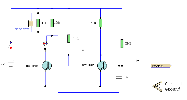 Blokadę DC powoduję 1n kondensator na końcu próbnika (sondy) i dwa etapy są pojemnościowo sprzężone. Gdy przełącznik jest przesunięty w przeciwną stronę (do niebieskiego punktu) oba tranzystory są przyłączone jako generatory astabilnej fali prostokątnej. Taki układ generuje drgania harmoniczne z dźwięku do kilkuset kHz.