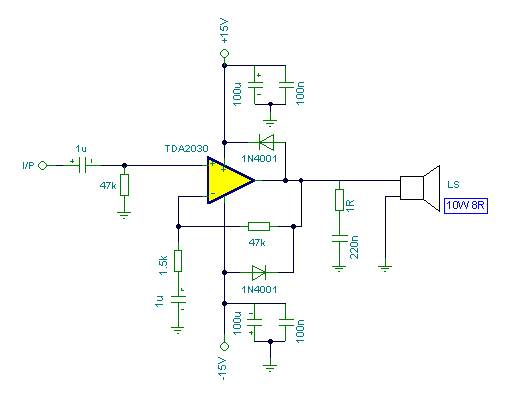 imo, że TDA2030 może dostarczyć 20 W mocy wyjściowej, umyślnie obniżono moc wyjściową do 8 Wat, aby zasilić 10 watowe głośniki. Wejściowa czułość wynosi 200mV. Wyższe wejściowe poziomy dadzą odpowiednio większe wyjściowe wartości, ale nie powinny być słyszalne zniekształcenia. Przyrost jest ustalany przez rezystory 47k i 1.5k. Układ TDA2030 jest dobrym zastępstwem wzmacniacza dla niskich i średnich dźwiękowych układów mocy. Sprawność głośnika określa dynamikę muzyki. Sprawność głośnika lub poziom ciśnienia akustycznego (SPL) przeważnie wyrażane są w [dB/m]. Głośnik, którego poziom ciśnienia akustycznego wynosi 97dB/m będzie brzmiał głośniej niż ten, którego poziom ciśnienia akustycznego wynosi 95 dB/m.