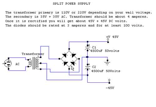 Transformator 230V/2x30V AC o mocy min. 150W. Diody 5A/100V.