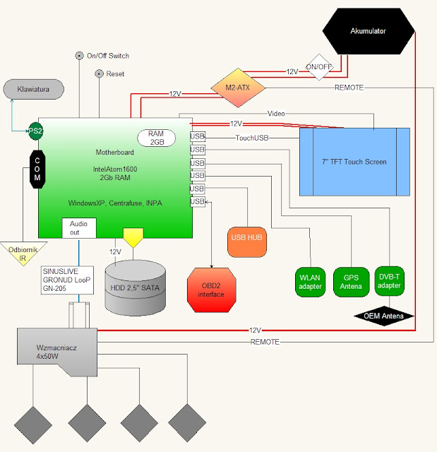 Nie polecam składania zestawu samemu. Jak koledzy wyżej napisali jest kilka opcji. Żeby to działało tak jak powinno, powinien być specjalny zasilacz ze stabilizatorem którego jedną część wpinasz normalnie do gniazda zapalniczki, a drugą gotową kość wpinasz do płyty głównej. Niestety takie małe ustrojstwo kosztuje nawet 2x tyle co cały komputer o przyzwoitych parametrach.