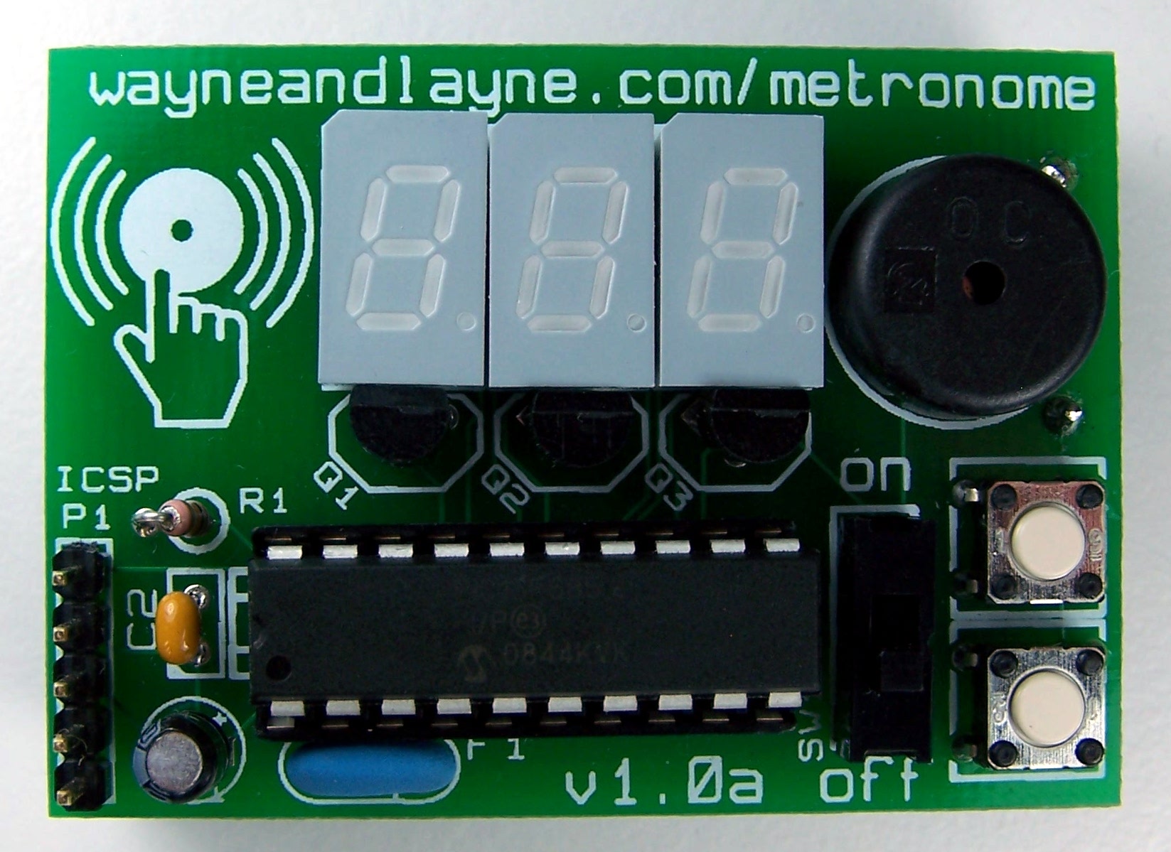 Poniżej przedstawiam projekt bardzo prostego w wykonaniu metronomu, programowanego stukaniem z funkcją zapętlania wystukanego schematu. Urządzenie oparte jest na mikrokontrolerze PIC16F685. Elementem aktywnym jest mały przetwornik piezoelektryczny, który zajmuje się nagrywaniem i odtwarzaniem. Po uruchomieniu metronom pokazuje słowo "tap" na wyświetlaczu segmentowym, co oznacza że jest gotowy do rejestracji wzoru. Użytkownik musi wystukać żądany schemat trzy razy, następnie odczekać aż minie czas rejestracji lub nacisnąć przycisk. Wyświetlacz pulsuje w trakcie wykrycia każdego uderzenia. Po przetworzeniu i wykonaniu niezbędnych obliczeń układ rozpoczyna odgrywanie "bitów" z tym samym tempem. Jeżeli zaprogramowano regularne metrum, np 4/4, to na wyświetlaczu ukaże się tempo uderzeń w czasie minuty. W innym przypadku urządzenie wyświetli ilość kompletnych wzorów na minutę. Metronom od strony sprzętowej jak i programowej zbudowany jest całkowicie na zasadach opensource. Na stronie autora dostępne są wszelkie schematy i źródła programu.