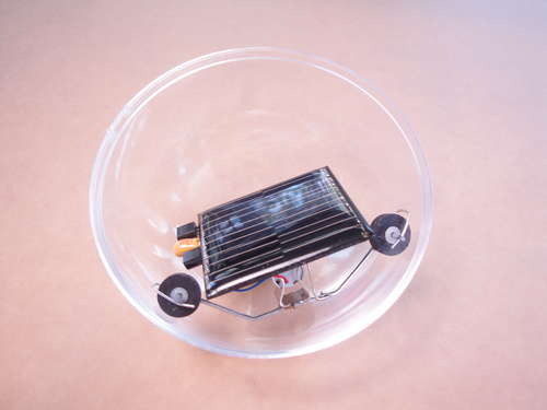 Zasada działania jest bardzo prosta. Niewielki panel solarny wystawiony na działanie światła ładuje kondensator. Po osiągnięciu odpowiedniego napięcia uruchamiany jest silnik, przenoszący napęd poprzez rolkę na ścianę sfery. Cała sfera jest nieduża, jej średnica wynosi 80mm. Układ umieszczony jest w dolnej części oraz wspierany trzema rolkami w postaci gumowych kółek, żeby zminimalizować przypadkowe obrócenie się ogniwa, co skutkowałoby brakiem zasilania. Niemniej jednak ze względu na prostotę, takie sytuacje mają miejsce, szczególnie przy uderzeniu kuli o ścianę. Do budowy ramy posłużył duży spinacz do papieru. Silnik wyciągnięty jest z aparatu wibrującego w telefonie. Sfera została kupiona w sklepie z artykułami świątecznymi.