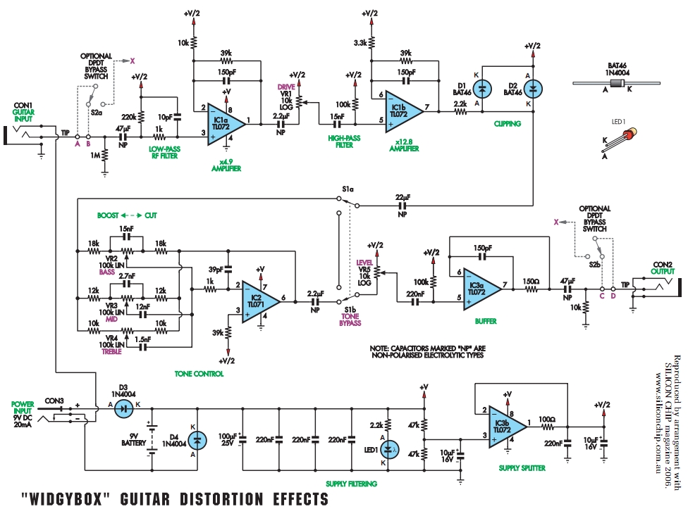 Przystawka ta bazuje na wzmacniaczach operacyjnych z serii TL07x. Na wejściu znajduje się filtr dolnoprzepustowy obcinający sygnały o częstotliwościach RF. Pierwszy stopień posiada wzmocnienie o wielkości x4,9. Dalej sygnał przechodzi przez filtr górnoprzepustowy i trafia do wzmacniacza operacyjnego o wzmocnieniu x12,8. Potencjometrem VR1 zmieniamy wysterowanie stopnia wzmacniającego. Do wyjścia drugiego stopnia wzmacniacza dołączono diody D1 i D2 (BAT46), które łagodzą efekt przesterowania. Są to diody Schottky`ego o mniejszym napięciu przewodzenia niż np. diody 1N4148/1N914. Zapewniają one większy zakres między przesterem łagodnym, a przebiegiem niemal prostokątnym. Po przejściu sygnału przez diody, trafia do trójpasmowego korektora dźwięku. Może on zostać pominięty przyciskiem S1. Końcowym stopniem tej przystawki jest wtórnik napięciowy, umieszczony za potencjometrem VR5, służącym do regulacji poziomu sygnału na wyjściu. Opcjonalnie, gdy zastosujemy przełącznik S2, możliwe jest ominięcie całego efektu. Przystawkę można zasilać z baterii 9 V lub zewnętrznego zasilacza.