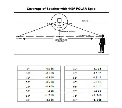 Przy projektowaniu systemu sufitowego bardzo istotnym parametrem jest kąt pokrycia w płaszczyźnie słuchacza poszczególnego głośnika. Nieścisłości w przedstawianiu parametrów przez producentów głośników prowadzą do powstania błędów w projektowaniu nagłośnienia sufitowego. Kąt promieniowania jest to kąt dla którego poziom ciśnienia akustycznego spada o 6 dB w stosunku do ciśnienia mierzonego na osi promieniowania głośnika. W specyfikacjach producentów kąt promieniowania obejmuje sferę oddaloną o 1 metr od głośnika w każdym kierunku. Ten parametr nie oddaje jednak sytuacji w miejscu płaszczyzny słuchacza. Płaszczyzna ta wyznaczona jest na wysokości od 1 do 2 m, w zależności od tego czy mierzona jest dla słuchaczy siedzących lub stojących. Kąt pokrycia jest zawsze mniejszy niż kąt promieniowania. Na powyższym rysunku widzimy przykład głośnika o kącie promieniowania równym 140 stopni. Widać również jaki błąd przy projektowaniu można popełnić w przypadku pominięcia kąta pokrycia. Na krawędzi płaszczyzny słuchacza poziom ciśnienia akustycznego jest o 15 dB mniejszy niż na osi głośnika. Wynikiem tego będzie duża nierównomierność ciśnienia akustycznego w nagłaśnianiu przestrzeni. W tabeli powyżej przedstawiono wartości korekcji jaką należy wprowadzić obliczając system nagłośnienia sufitowego.