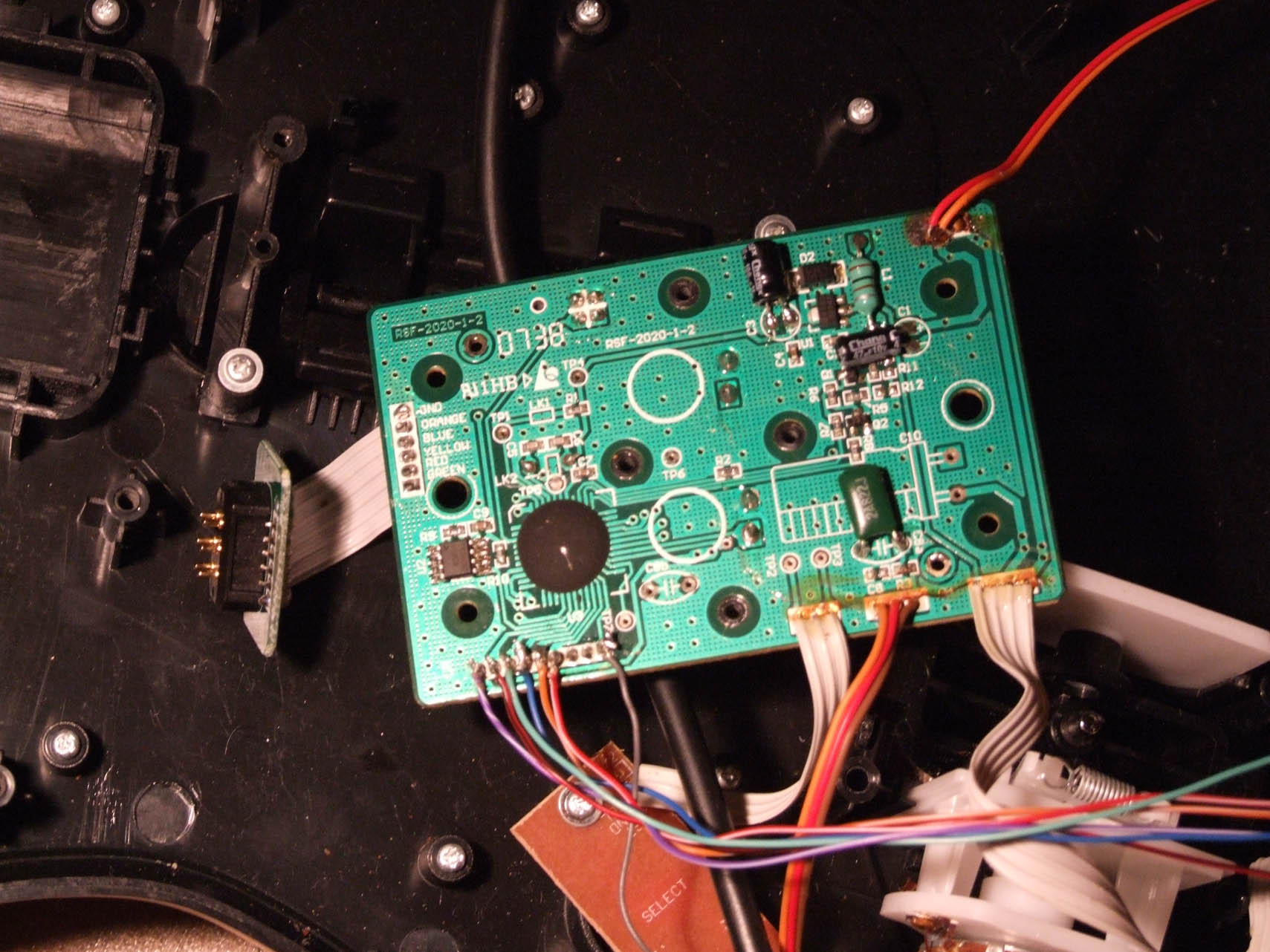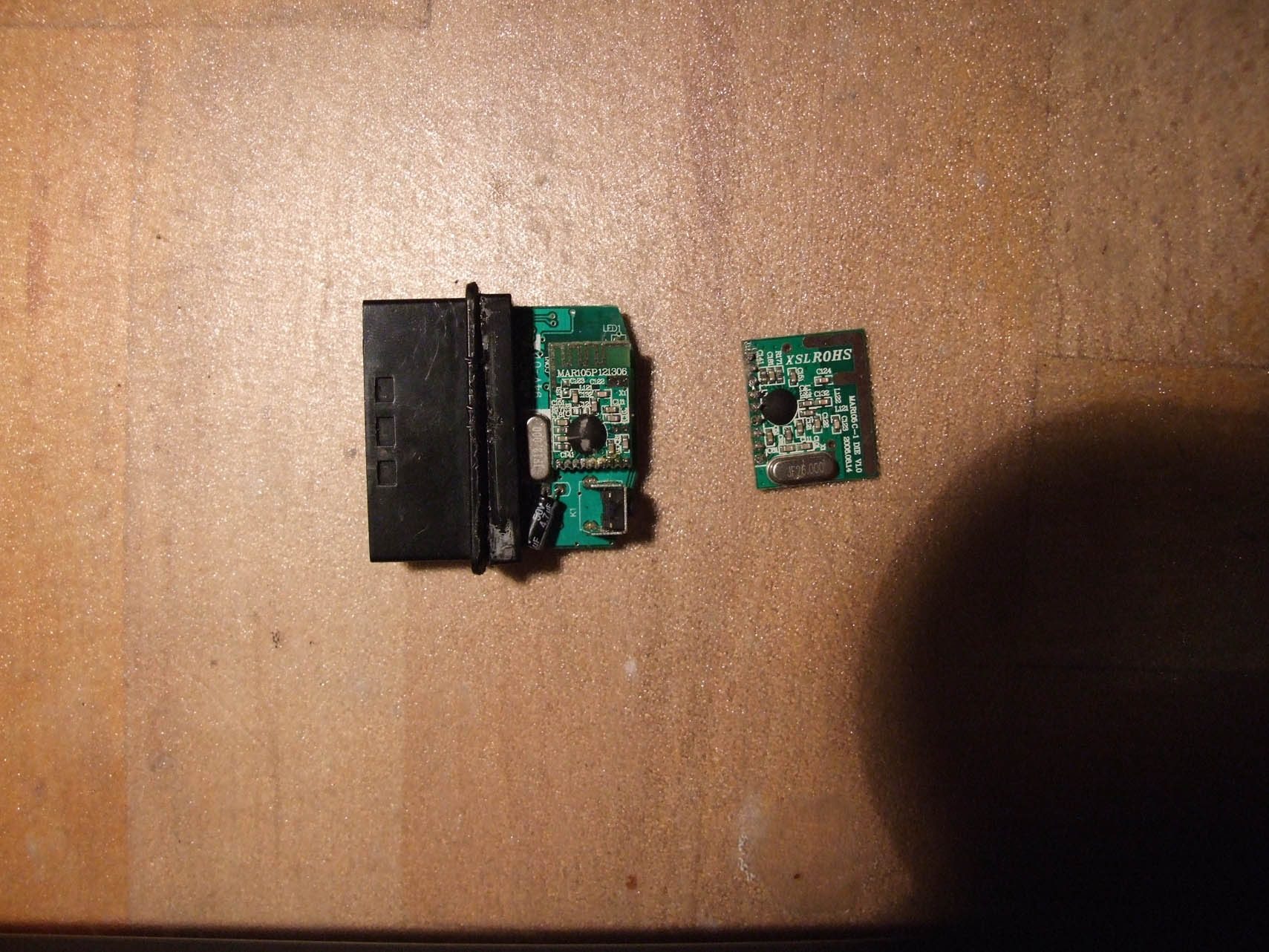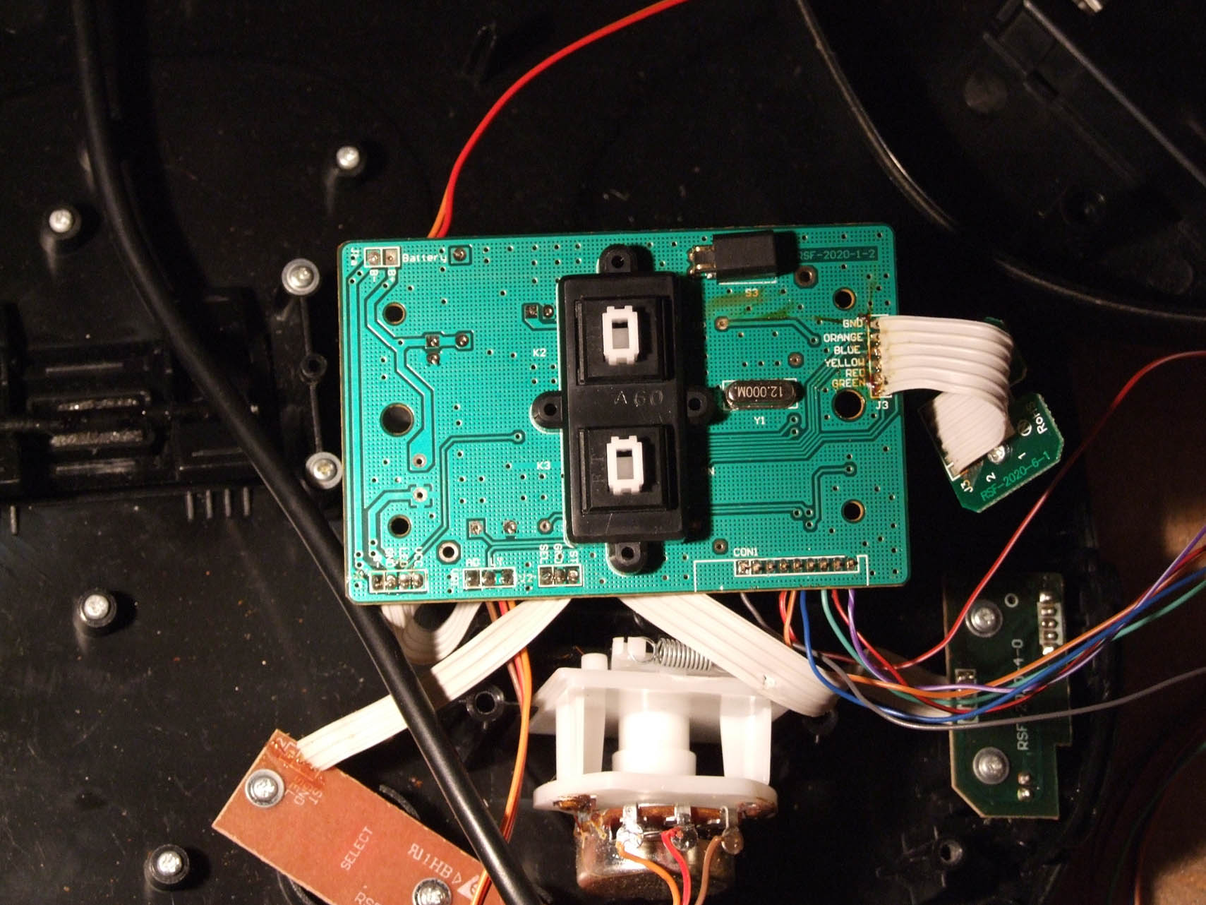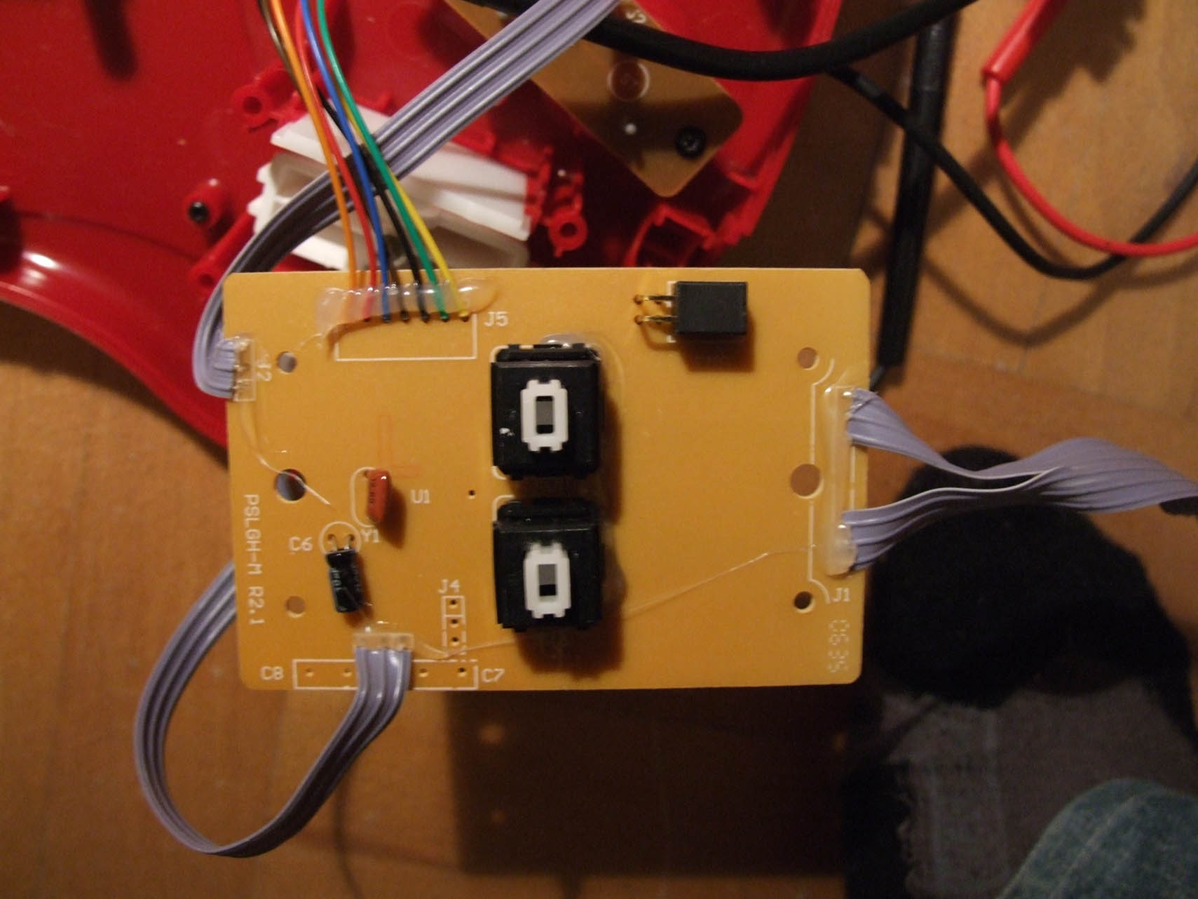 W gitarze przewodowej przewody są przynajmniej oznaczone kolorami, także wiadomo gdzie jaki przewód i do jakiego pinu we wtyczce idzie. W gitarze bezprzewodowej ten nadajnik był po prostu wlutowany bezpośrednio do płytki, bez żadnych kabli. Przylutowałem wszystkie przewody do płytki, ale nie połączyłem ich jeszcze z wtyczką do PS2, bo nie mam pojęcia jak. Jedyny pin, do którego przylutowałem kabel i wiem, za co ten pin odpowiada jest GND (łatwo go było znaleźć). No ale niestety, z pozostałymi 6 pinami mam problem, bo nie mam pojęcia jaki kabel ma iść do jakiego pinu we wtyczce, a sprawdzać wszystkich kombinacji po kolei jakoś nie mam ochoty.